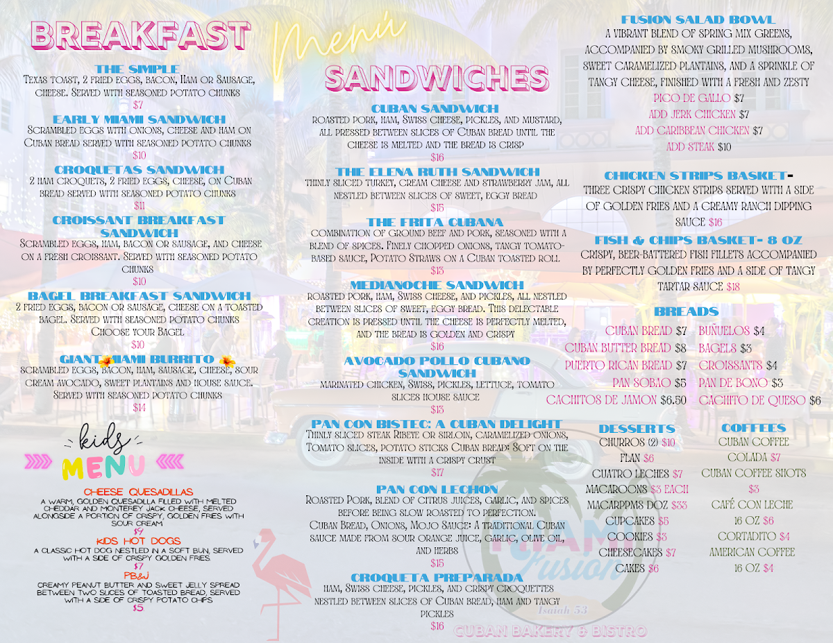 If you’re craving a delightful fusion of flavors, the Miami Fusion Cuban Bakery & Bistro Menu is the perfect choice. Located at 1949 Lynnhaven Pkwy in Virginia Beach, this spot brings together the vibrant tastes of Cuban cuisine with a creative twist that reflects Miami’s eclectic food scene. From freshly baked Cuban pastries that melt in your mouth to savory dishes like ropa vieja and succulent seafood, every item is crafted with care. Whether you’re in the mood for a light snack or a hearty meal, there’s something here to satisfy every craving. The menu’s variety of flavors promises a unique dining experience, blending traditional Cuban ingredients with a contemporary flair. Don’t forget to try one of their refreshing mojitos or the flavorful cafe con leche - the perfect complements to any dish you choose.